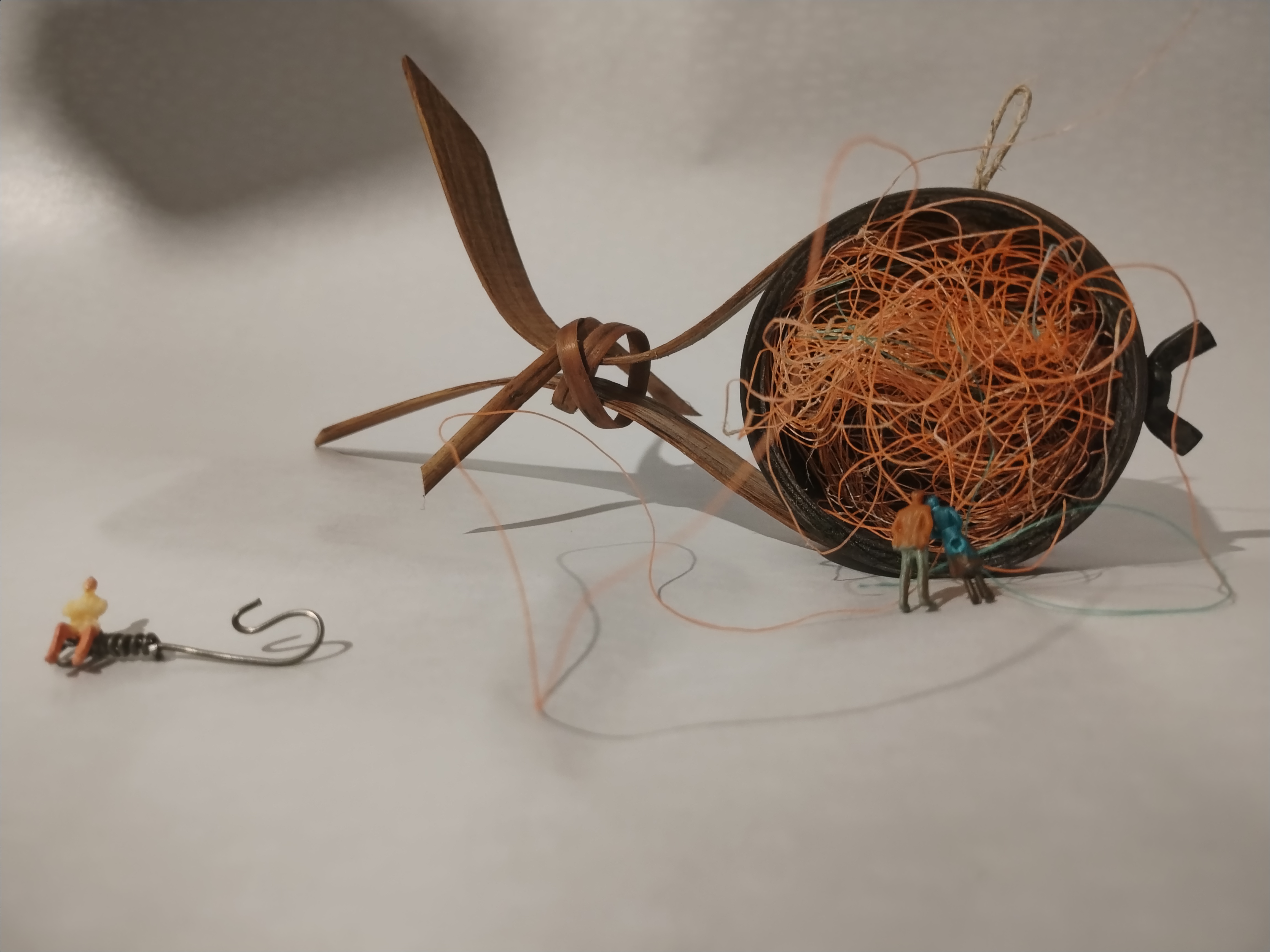 RIBA S PLASTIKOGallery: ODŽAGANCI / THE ENDSDescription: Krivljen les vinskih sodov, konzerva tune, plastika nabrana na obali Jadranskega morja.